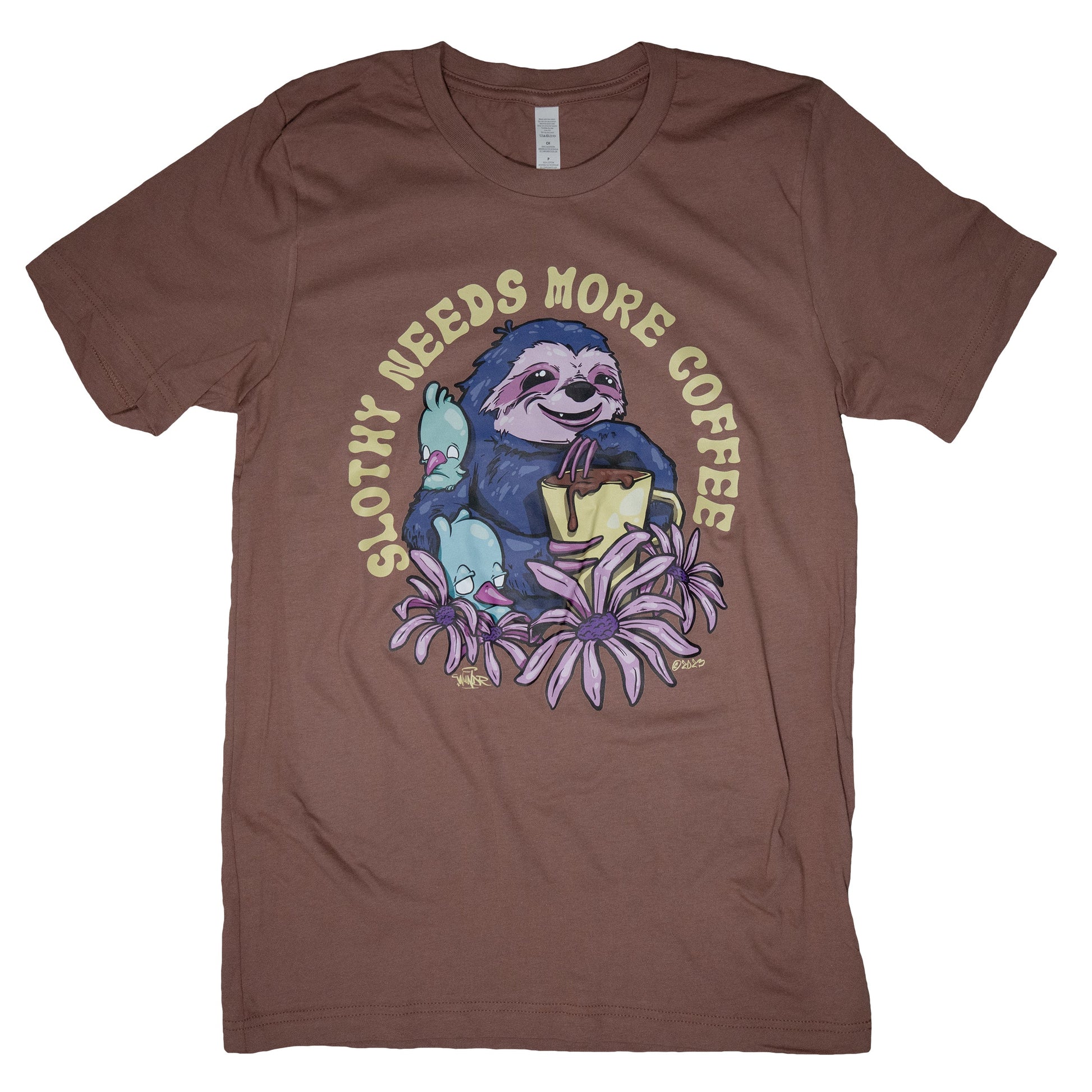 Slothy Needs More Coffee x Wundr Tee. We collaborated with Minneapolis Based Street Mural Artists Wundr to make this fun sloth, coffee themed tee featuring some of the Wundr Byrds and signature Wundr Style.